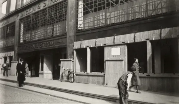 Ole M. Engelsens fotografier fra okkupasjonsårene i Oslo. Slik ble vindusrutene sikret for å hindre at glasset skulle splintres ved flyangrep. Lemmene og sanden skulle gjøre tilfluktsrommene i kjelleren tryggere..Bildet er tatt utenfor varemagasinet Steen og Strøm, april 1940.