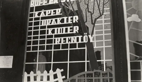 Ole M. Engelsens fotografier fra okkupasjonsårene i Oslo. Slik ble vindusrutene sikret for å hindre at glasset skulle splintres ved flyangrep. ."Hoff er størst i kåper, drakter, kjoler, Regntøy". .Bildet er tatt utenfor Hoff damekonfeksjon i Karls Johans gate 25, mai 1940.