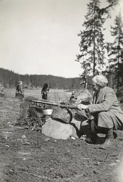 Majorstua AUL "Frihet" på utflukt til Åklungen i Nordmarka..Pinsen 1938. Olaf Lunde koker kaffe. Lunde var møbelsnekker og veteran i arbeiderbevegelsen, med utallige verv innen både faglige og politiske organisasjoner. AUF..