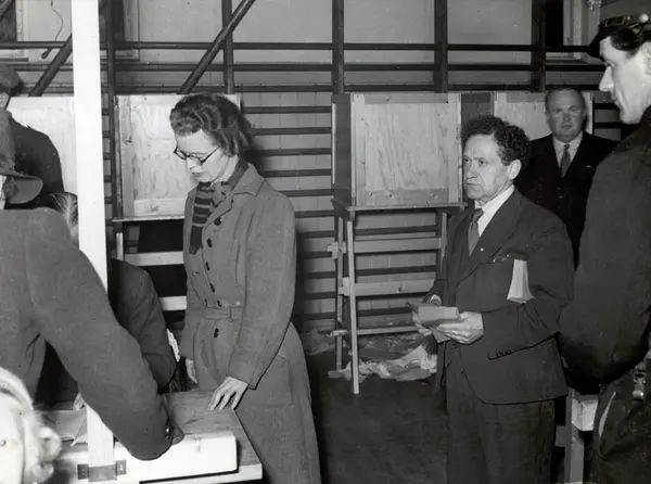 Kommunevalget 1945. Stortingsrepresentant Rakel Seweriin avgir sin stemme i valglokalet på Bolteløkka skole. Bak henne står Nils Heggland fra Gullsmedarbeiderforbundet