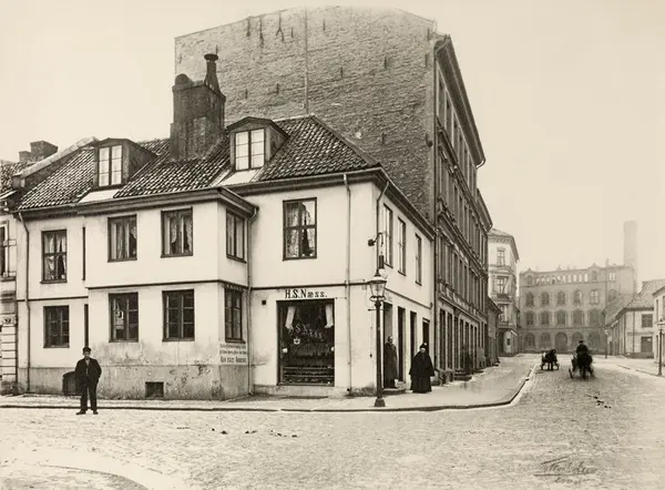 Hjørnet av Tollbugata og Akersgata i Kristiania/Oslo. Skomaker H. S. Næss' forretning midt på bildet. "Skotøj af de mest brugelige sorter for damer, herrer og börn i stort utvalg. Kun eget arbeide". 1895