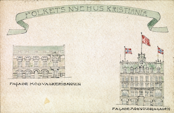 Trekkpapir med reklame (arkitekttegninger) for Folkets Hus. "Folkets Nye Hus Kristiania". Tegningene viser: "Facade mod Vaskeribakken" og "Facade mod Youngsgaden". Mulig 1907.