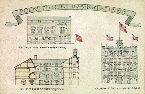 Trekkpapir med reklame (arkitekttegninger) for Folkets Hus. "Folkets Nye Hus Kristiania". Tegningene viser: "Facade mod Vaskeribakken", "Snit med gaardsfacade" og "Facade mod Youngsgaden". Mulig 1907.