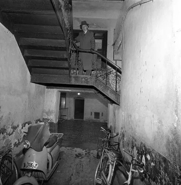 Brugata 17. Holtermann Knudsens trykkeri. Petter Pedersen på gamle tomter. November 1959