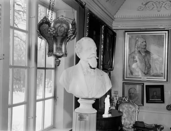 Frogner hovedgård. Bymuseet. Byste av generalkonsul Peter Petersen (Peter Nydelig). Til venstre for ham henger dronning Josefines bønnelampe. Mars 1950.