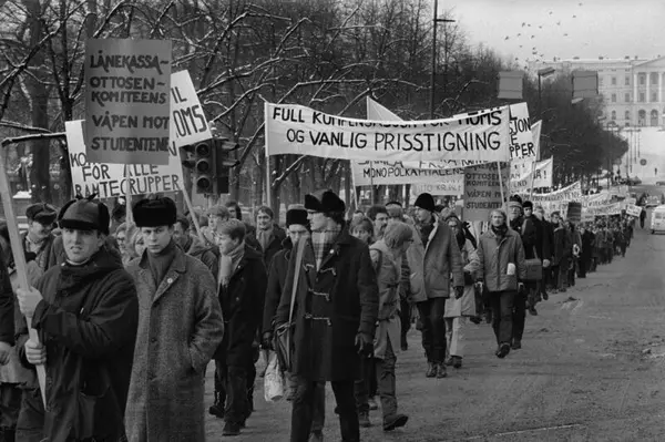 Faglig Studentfront og Studentersamfundet arrangerte demonstrasjonstog mot Moms. Toget gikk fra Universitetsplassen til Kirke- og Undervisningsdepartementet. "Lånekassa - Ottosen-komiteens våpen mot studentene". Februar 1970