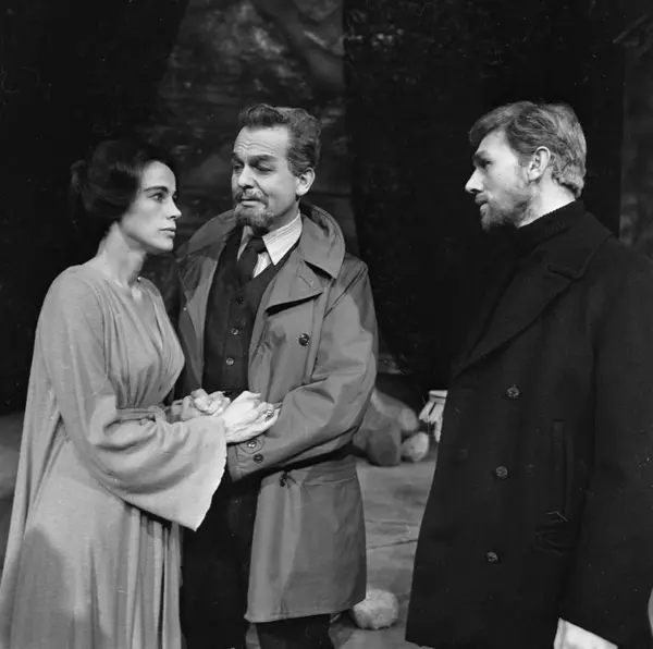 Nationaltheatret. Hovedscenen..FRUEN FRA HAVET av Henrik Ibsen. Premiere: 03.02.1968..Per Sunderland i rollen som dr. Wangel, Henny Moan som Ellida Wangel og Joachim Calmeyer som Den Fremmede.