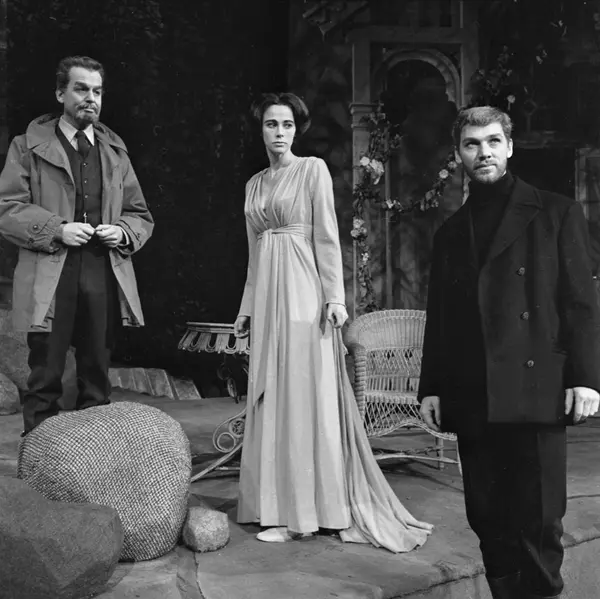 Nationaltheatret. Hovedscenen..FRUEN FRA HAVET av Henrik Ibsen. Premiere: 03.02.1968..Per Sunderland i rollen som dr. Wangel, Henny Moan som Ellida Wangel og Joachim Calmeyer som Den Fremmede.