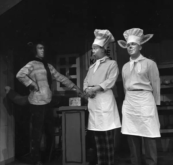 Nationaltheatret. Hovedscenen..DYRENE I HAKKEBAKKESKOGEN av Thorbjørn Egner. .Premiere: 19.09.1969..Knut Husebø som Mikkel Rev, Arne Lie som Bakermester Harepus og Odd Sandnæs som Bakergutt.