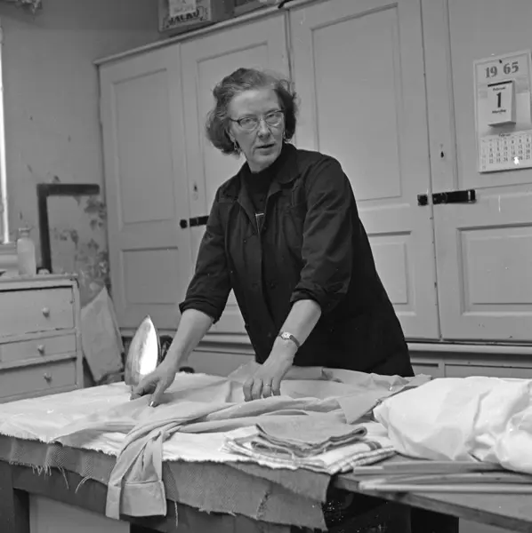 Nationaltheatret bak kulissene. .Serie med fotografier fra tekniske avdelinger, malersal, snekkerverksted, kostymeavdeling etc. .1964 og 1965..Reprisen. Stryking av kostymer. Ukjent.
