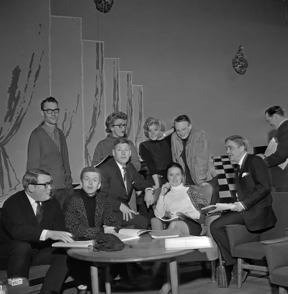 Fra prøvene til musikalen Fantasticks på CHAT NOIR 1965..Fra venstre: Per Lekang, Alfred Maurstad, Arve Opsahl, Anita Thallaug og Svein Wickstrøm. .Bak: Einar Iversen, Kirsten Sørlie, Grynet Molvig, Kjetil Bang-Hansen og ukjent.