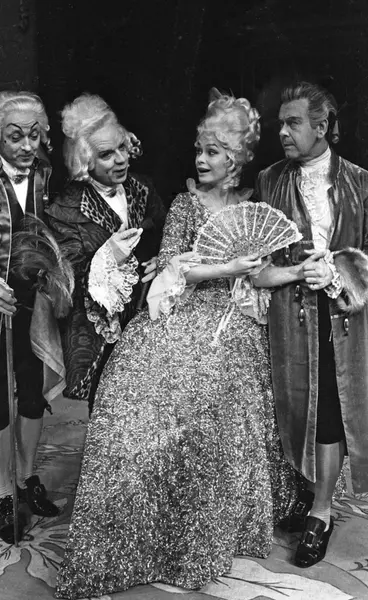Nationaltheatret. Hovedscenen..SKANDALESKOLEN av Richard Brinsley Sheridan..Premiere 26.12.1969..Medvirkende: Per Aabel, Henki Kolstad, Ella Hval, Astrid Folstad, Frank Robert, Ingerid Vardund, Kjell Stormoen o. a..Fra venstre: Frank Robert, Henki Kolstad, Ingerid Vardund og Per Aabel.
