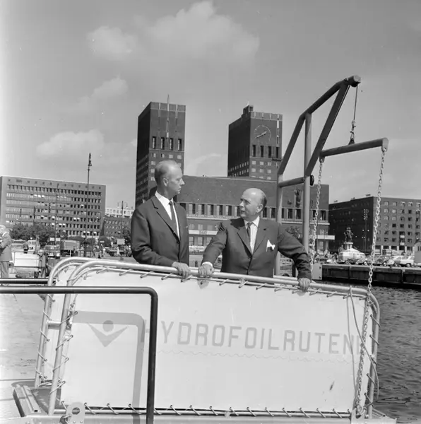 Havna. Den nye hydrfoilterminalen på utstikker D innviet..Ordfører og formann i Oslo Havnevesen Brynjulf Bull, og direktøren i Hydrofoilrutene, skipsreder Ivar Kaldager står på en av de spesialbygde landgangene på utstikker D ved den nye hydrofoil-terminalen. Juli 1964