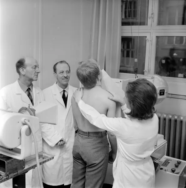 Helserådet. Slutt med skjermbilde på bedriftene. Selektiv røntgenfotografering gir større trygghet for alle. Søster Bjørg Ødegård ber sjøgutten John Pedersen trekke pusten og holde den, mens doktor Aksel Frøili og fullmektig Ragnar Lund holder et våkent øye med det hele. April 1967