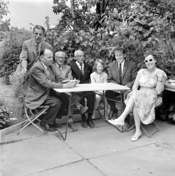Hjemmets Kolonihage på Bjølsen. Bygartner Johan Kristiansen, Viggo Halvorsen, byplansjef Erik Rolfsen, lille Sølvi, Anker Braathen og Jenny Andersen. Juni 1963