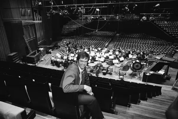 Konserthuset: Siste forberedelser i forbindelse med åpningen. Ventilasjonstekniker Bjørn Johansen tar seg fem minutter for å høre på Filharmonisk Selskapsorkester..Mars 1977