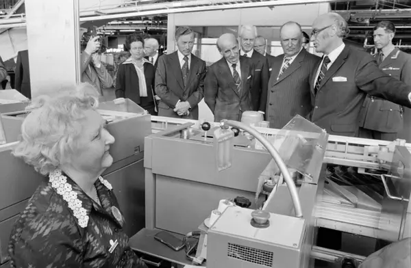 Postgirobygget . Kong Olav i brevavdelingen hvor han får demonstrert hvilke behandling et brev gjennomgår. Ved en kodepult for brev sitter kodeoperatørHabba Akerholdt. T.h. distriktssjef for Oslo, Arne Dybvik. I Kongens følge var blant annet stortingsrepresentantene Ragnar Christiansen og Guttorm Hansen. April 1976