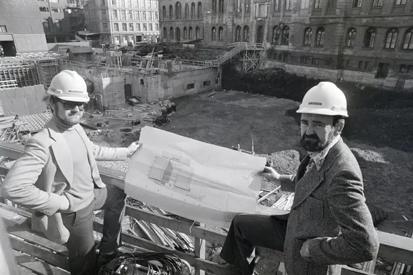 Regjeringsbygningen. Y-blokken. Nytt regjeringsbygg til 40 mill. kroner. Byggleder Willy Bråten (t.h.) og sivilingeniør Inge Dolve viser en skisse av fasaden ut mot Hospitalsgata. September 1976