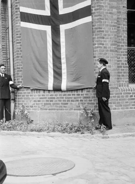 Seilduksfabrikken. Avduking av minneplate over Roar G. Welo og Knut Jørgensen som falt under krigen. Formannen i fabrikkens direksjon, høyesterettsadvokat P.A. Holm foretok avdukingen. Juni 1946