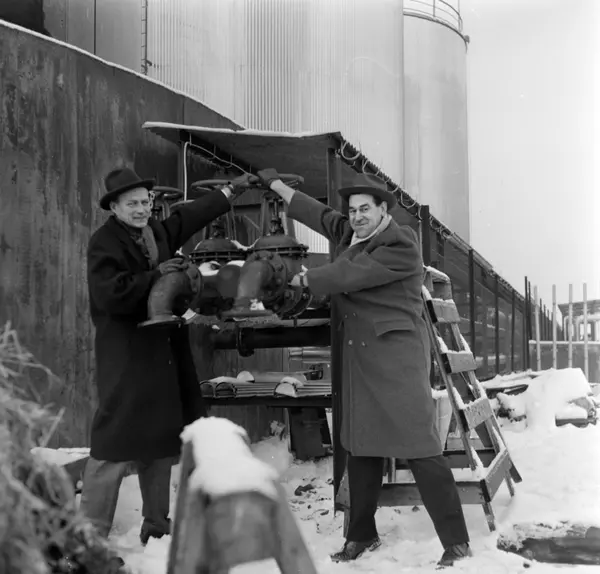 NKLs nye importanlegg for olje og bensin på Sjursøya blir tatt i bruk. Salgssjef i OFA, Eivind Owren (t.v.) og direktør i NKL, Peder Søiland. Januar 1961