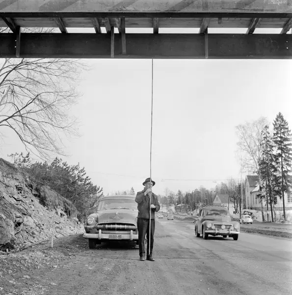Sjølystveien.Ny gangbru over Sjølystveien..Tung-transportmannen L. Sandvik i Transportsentralen fortviler over at brua har for lav høyde over veibanen..Mars 1962