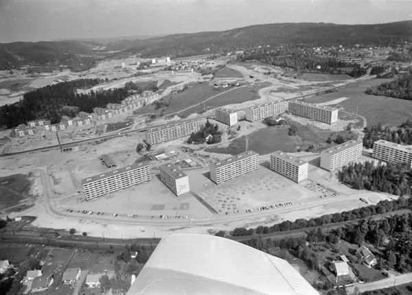 Fra en reportasje i Arbeiderbladet. Billedtekst: Ny bydel tar form. Én milliard investert. 20 000 får bolig på Tokerudfeltet. I forgrunnen ser vi Haugenstua-bebyggelsen. Flyfoto. 30. August 1969