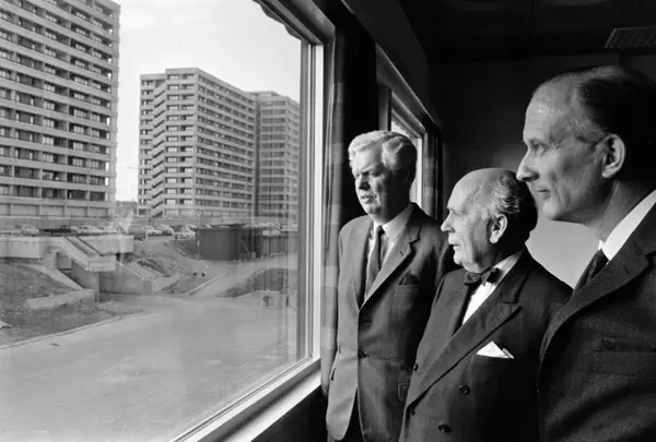 Tveita samfunnshus innviet. Fra høyre: Formann i Samfunnshuskomiteen, Reidar Bollum, ordfører Brynjulf Bull og direktøren i OBOS, Ivar Mathiesen. Juni 1971