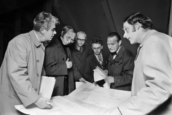 Tøyen transformatorstasjon skal bli Oslos kulturskatt. På befaring: Fra venstre: Kulturrådmann Dagfinn Austad, Bengt Calmeyer, Georg Lieungh fra Oslo AUF, Harald Løvaas fra kulturrådmannens kontor, overingeniør Egil Ravn-Paulsen og ingeniør Bjørn Pedersen fra Oslo Lysverker. Oktober 1972