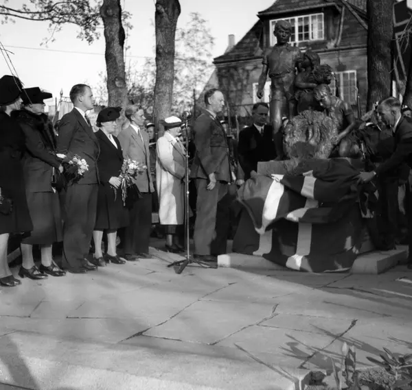 Monumentet over de falne under andre verdenskrig i Ullevål skolekrets, avduket. Nærmest monumentet, generalløytnant Olaf Helset og formannen i monumentkomiteen, dr. phil. Sigurd Willoch. Mai 1948.