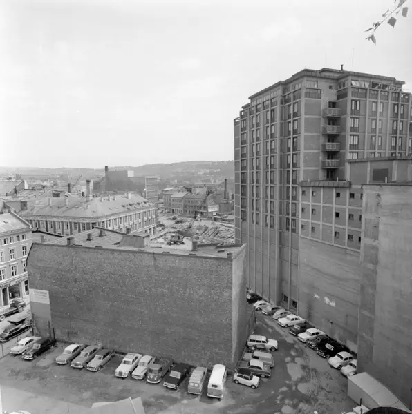 Viking Hotell, og omgivelser. På området ut mot Nygata, Stenersgata og Gassmanngården skal Hotell Vikings nye fløyer reise seg. Bygget midt på bildet vil bli revet. Mai 1964