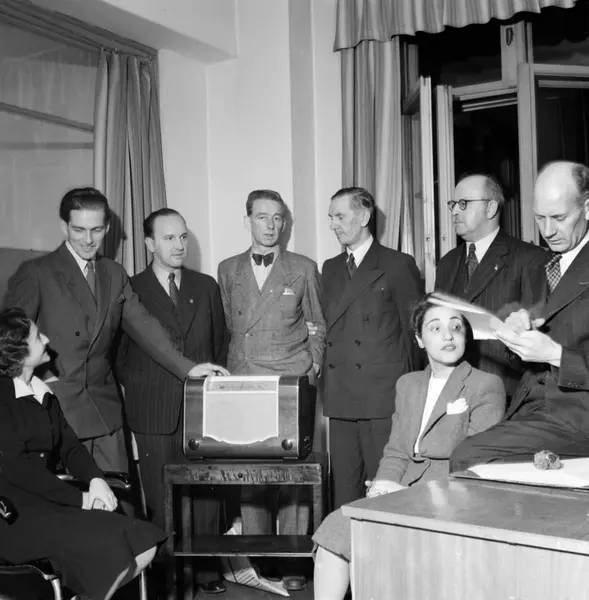 Stortingsvalget, oktober 1945. Besøk i Arbeiderbladets redaksjon, valgnatten. Fra venstre: Fru major Galenson fra den amerikanske ambassade i Oslo, redaktørene Arne Bjørnberg og Herbert Yve fra Stockholm, statsrådene Lars Evensen og Oscar Torp, Ernst Christiansen fra "Socialdemokraten" i København, statsminister Einar Gerhardsen og Miriam Sluchin fra den amerikanske ambassade i Oslo.