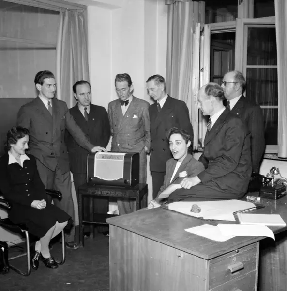 Stortingsvalget, oktober 1945. Besøk i Arbeiderbladets redaksjon, valgnatten. Fra venstre: Fru major Galenson fra den amerikanske ambassade i Oslo, redaktørene Arne Bjørnberg og Herbert Yve fra Stockholm, statsrådene Lars Evensen og Oscar Torp, Ernst Christiansen fra "Socialdemokraten" i København, statsminister Einar Gerhardsen og Miriam Sluchin fra den amerikanske ambassade i Oslo.