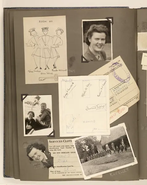 Album laget av Sissel Lie, senere Bratz (1922-1983). Foto og utklipp fra tiden hun tjenestegjorde i Den norske hærs kvinnekorps i Storbritannia under andre verdenskrig. Hun oppnådde graden fenrik i kontrolltjenesten. Albumet har tittelen Sissels Scrapbook fra 1944-45. Side 58: Ulike bilder og minner fra dagene i WAAF.
