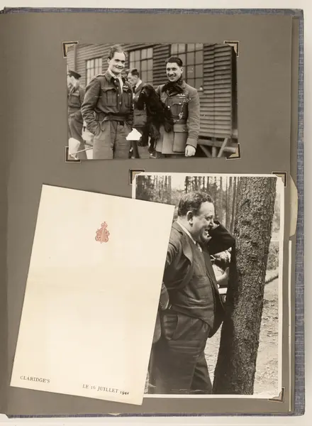 Album laget av Sissel Lie, senere Bratz (1922-1983). Foto og utklipp fra tiden hun tjenestegjorde i Den norske hærs kvinnekorps i Storbritannia under andre verdenskrig. Hun oppnådde graden fenrik i kontrolltjenesten. Albumet har tittelen Sissels Scrapbook fra 1944-45. Side 105: To fotografier og en meny fra Claridges, datert 16. juli 1942. Foto nederst t.h er et portrett av Trygve Lie. ..