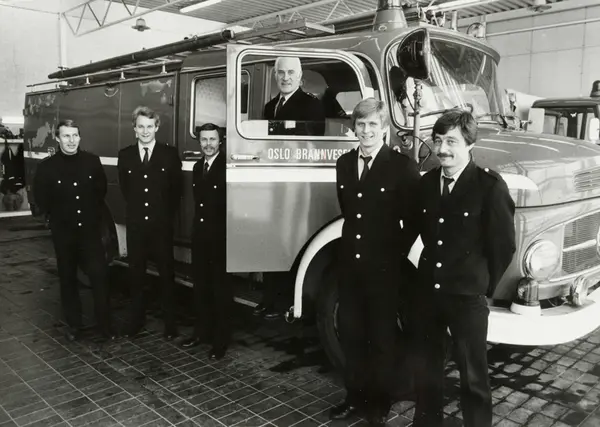Grorud brannstasjon. Fra v.: Arne Berg, Kay Hagberg, Tom Kristiansen, Thor Petersen, Morten Engmann og Arild Pedersen ved en av de moderne bilene. Desember 1981