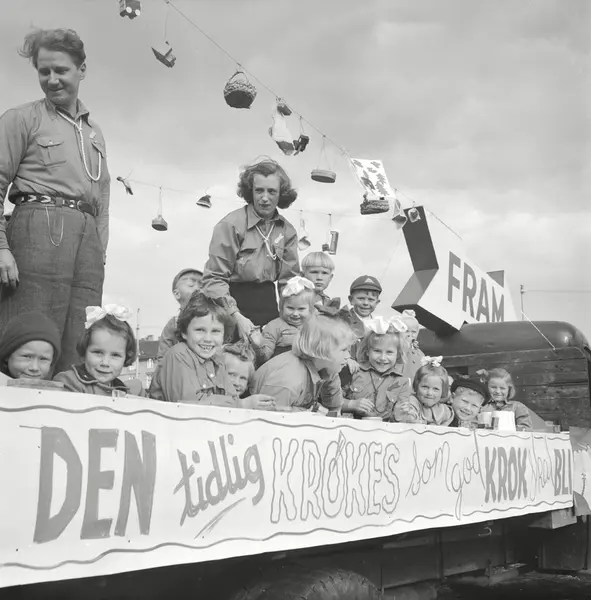 Oslo Framkrets. 1. Mai 1952. Framfylkingens arrangement, Barnas 1. mai på Dælenenga. Transparent med teksten: Den skal tidlig krøkes som god krok skal bli.