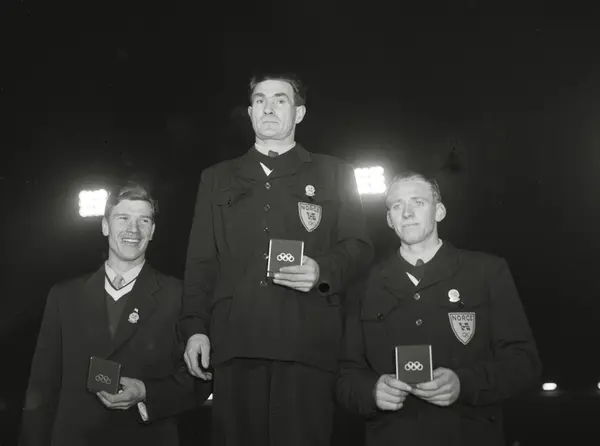 Olympiske vinterleker i Oslo 1952. Premieutdeling for kombinerte renn. Fra venstre: Heikki Hasu, Finland, Simon Slåttvik (Gullmedalje) og Sverre Stenersen, begge fra Norge.