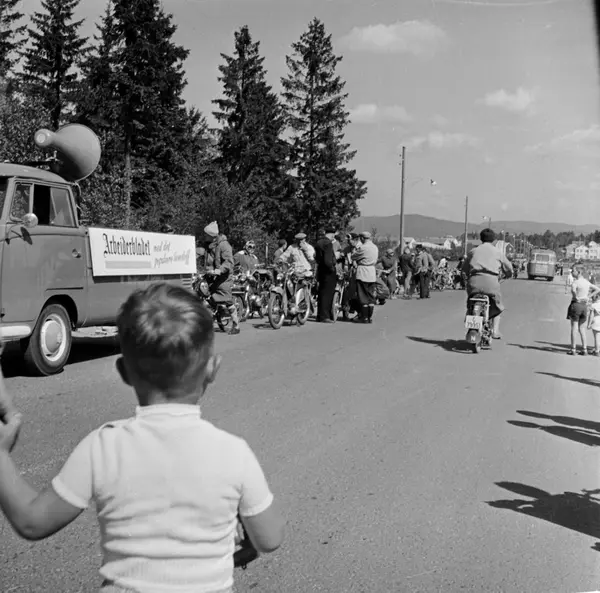 Arbeiderbladet arrangerer moped-tur fra Yongstorget til Frambu (Siggerud i Ski kommune) i samarbeid med Norges Sykkel- og Mopedeieres Forening, 10. juni 1958.