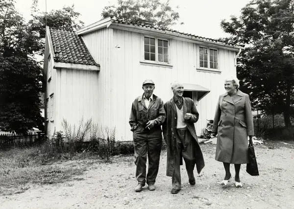 Manglerud gård. Dugnad med å sette i stand den tidligere drengstua. Initiativtakerne, fra høre: Pensjonistforeningens formann Anna Syvertsen, Ole Martin Bjørnstad og Kåre Kristiansen. August 1977