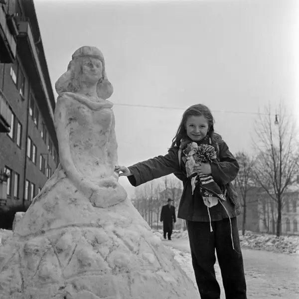 "På hjørnet av Ole Bulls gate og Chr. Michelsens gate har noen laget denne flotte snøskulpturen. Den vekker daglig stor beundring hos forbipasserende. På bildet ser vi Lise Gun Wagle ved siden av kunstverket. " Vinteren 1958.