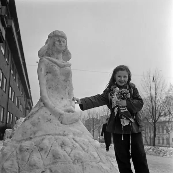 "På hjørnet av Ole Bulls gate og Chr. Michelsens gate har noen laget denne flotte snøskulpturen. Den vekker daglig stor beundring hos forbipasserende. På bildet ser vi Lise Gun Wagle ved siden av kunstverket. " Vinteren 1958.