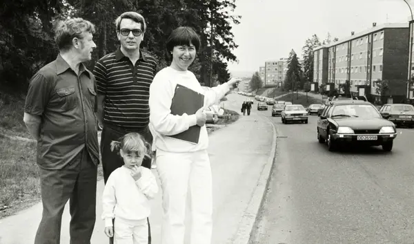 Munkelia borettslag. Bjørn Rudaa, sekretær i borettslaget sammen med Harald Berger, formann, og Eli Sjæret Andersen, sekretær i trafikkutvalget ved den trafikkerte Langbølgen. Mai 1981