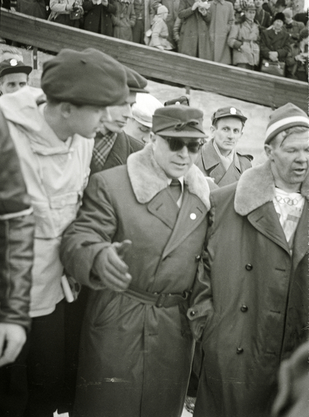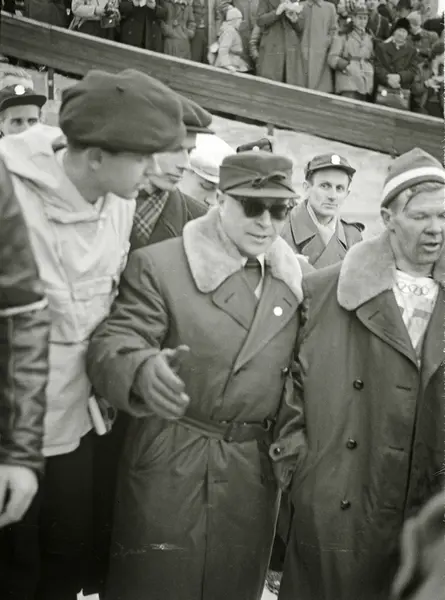 Vinter-OL 1952. De sjette olympiske vinterleker, arrangert i Oslo, 14.-25. februar 1952. Sølvmedaljevinner på 50 km, Eero Kolehmainen (til høyre) og finsk lagleder.