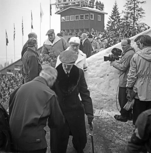 De sjette olympiske vinterleker, Oslo 14.-25. februar 1952. Kong Haakon VII, president i den internasjonale olympiske komité, Avery Brundage og Kronprins Olav på tribunen i Holmenkollen. Til høyre med filmkamera: Finn Bergan.