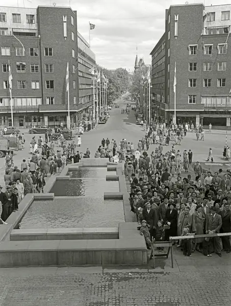 Feiringen av Oslo bys 900-års jubileum, mai 1950. Innvielsen av Oslo Rådhus. Folkemengde i Borggården - Fridtjof Nansens plass. Universitetsgaten. Nå Roald Amundsens gate.