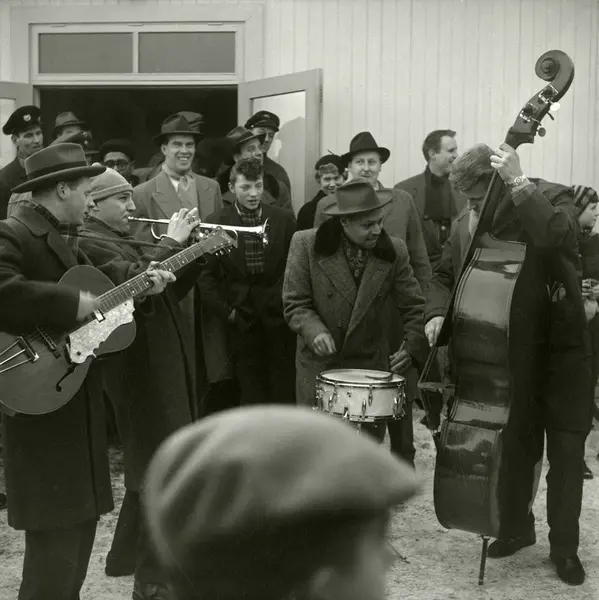 Jazz at the Philharmonic besøker Oslo februar 1956. Ankomst på Fornebu, hvor det ble gitt en velkomstkonsert. Fra venstre; Arne Bendiksen på gitar, Rowland Greenberg på trompet, Dizzy Gillespie (med briller), Jo Jones på trommer, Øystein Ringstad (med hatt) og Bjørn Pedersen på bass.