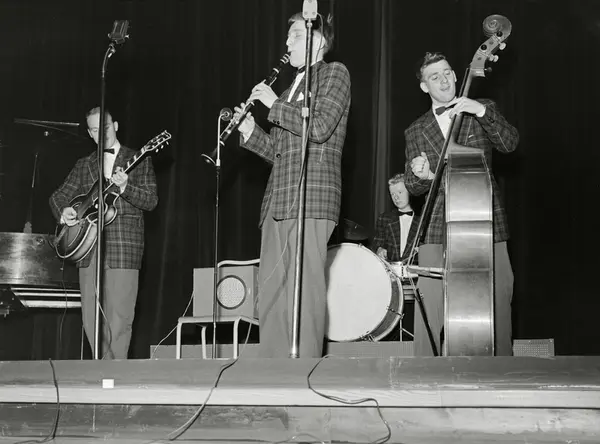 Grewe Combo fra Horten spiller på amatørkonkurranse for norske jazzband - Norgesmesterskap i jazz. Arrangert 24. november 1957 i Oslo. Fra venstre; Knut Greger Eriksen på gitar, Rolv Wesenlund på klarinett, Knut Lind Frodesen på trommer og Oddvar Kjærran på bass.