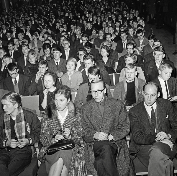 NM i jazz for amatører. 25. November 1962. Publikum i Klingenberg kino. I første rekke (med briller), forfatteren og journalisten Bengt Calmeyer. På femte rad til venstre i bildet, sangerinnen Karin Krog.