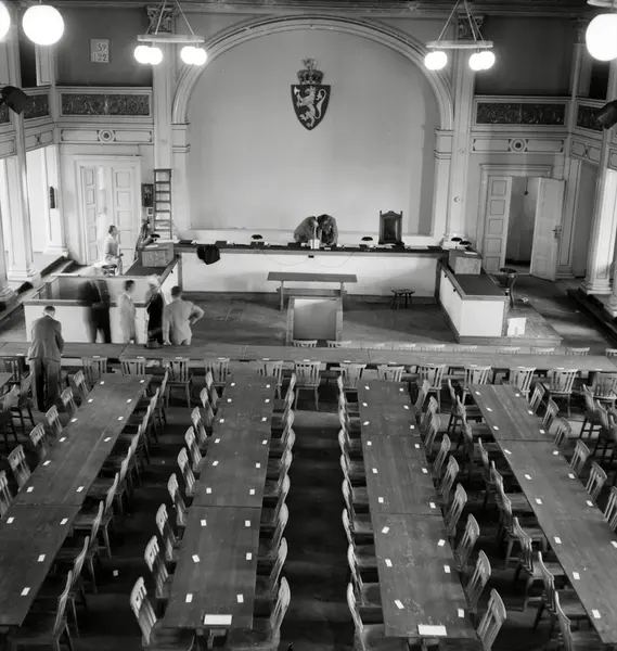 Landssvikoppgjøret. Straffesaken i Eidsivating lagmannsrett mot Vidkun Quisling i Losjens store sal i Oslo. Salen gjøres i stand. August til september 1945.