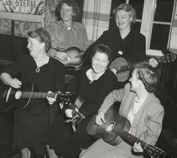 Simensbråten kvinnegruppe av DNA feirer sitt 5-års jubileum med gitarspill. Fra venstre: Margit Gammelsrud, Ågot Johansen, Lydin Jacobsen, Else Pedersen og Magnhild Johansen. November 1950